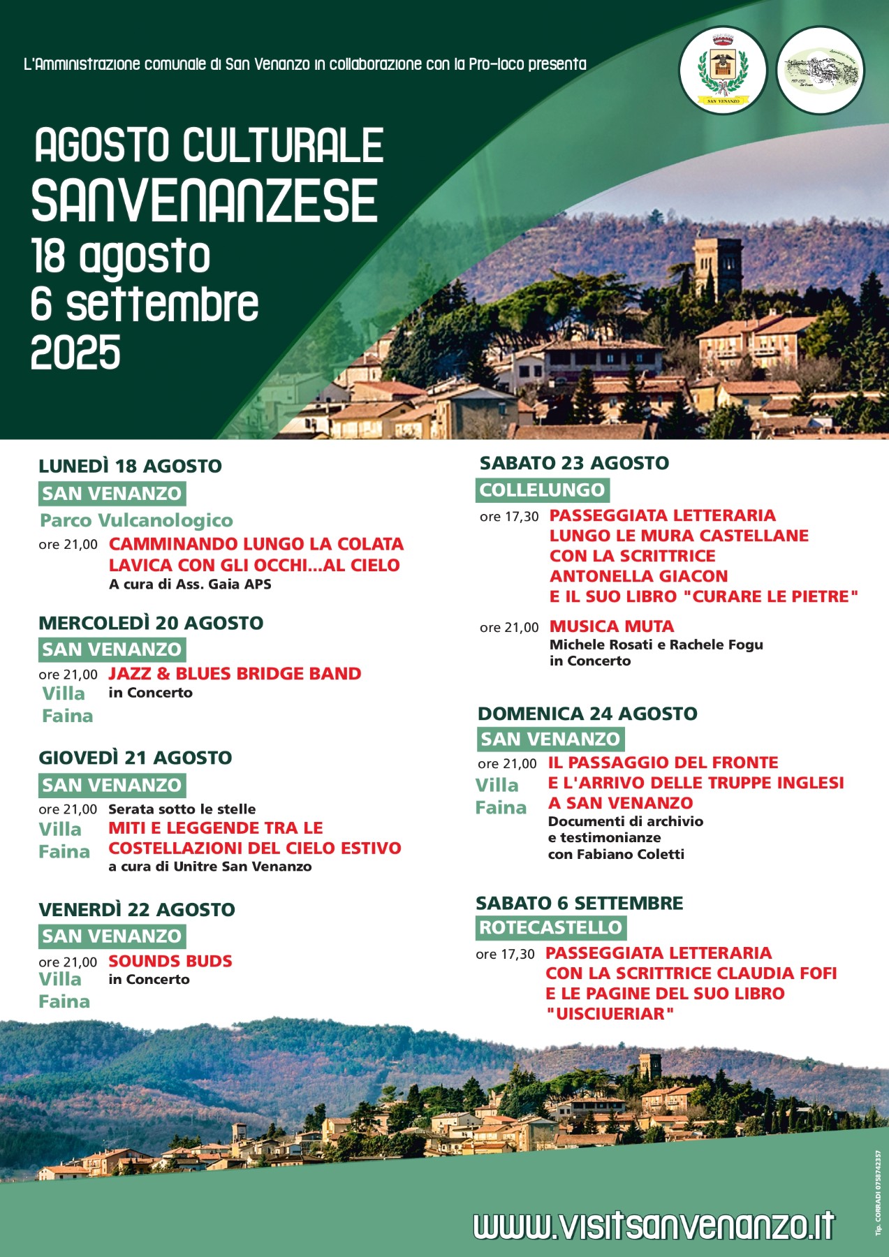 Dal 18 agosto al 6 settembre 2025 torna “L’agosto Culturale Sanvenanzese”, consueto evento annuale di fine estate che offre un ricco programma di attività culturali, tutte ad ingresso gratuito, frutto della collaborazione tra l’Aministrazione Comunale e le Associazioni locali, ambientate in varie locations di pregio del territorio comunale.