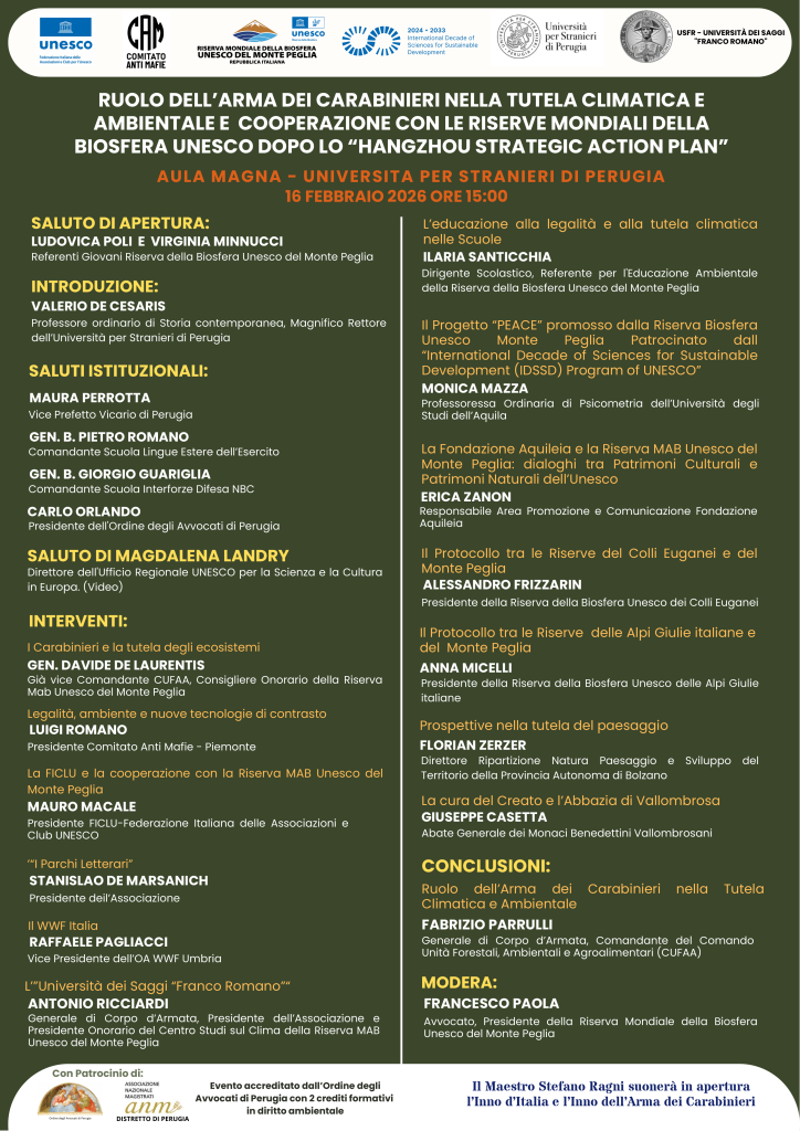 Si terrà a Perugia, presso l’Aula Magna dell’Università per Stranieri di Perugia a partire dalle ore 15:00 di lunedì 16 febbraio, il convegno “Ruolo dell’Arma dei Carabinieri nella tutela climatica e ambientale e cooperazione con le Riserve Mondiali della Biosfera UNESCO dopo lo ‘Hangzhou Strategic Action Plan’”.